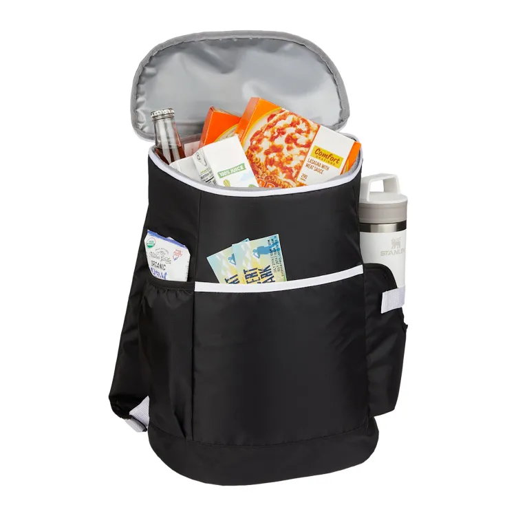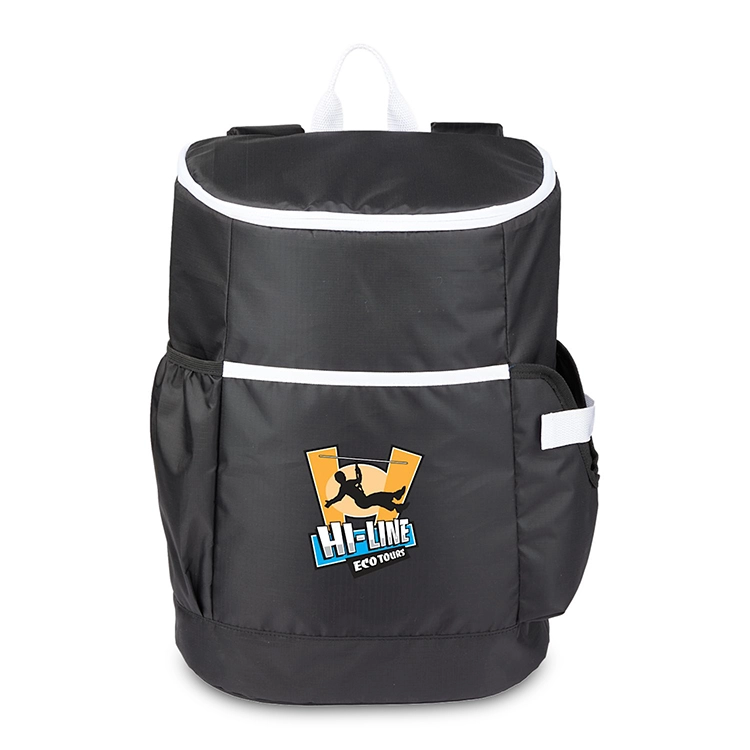 Constructed with 100% recycled 210D polyester, this backpack cooler offers hands-free transport for food and beverages. The insulated interior with gray PEVA lining helps maintain cooler temperatures while allowing easy cleanup. Two side pockets support hydration, including a mesh bottle holder and a compartment sized for tumblers with handles. A front slash pocket stores smaller essentials, while adjustable padded shoulder straps provide balanced carrying during travel or events. The product also supports environmental nonprofits through a partnership with 1% For The Planet.