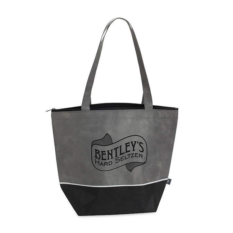 The rPET Foam Insulated Cooler Tote - 15 3/8" x 12 1/2" is made with eco-friendly 80 GSM recycled PET non-woven from 100% post-consumer water bottles. It comes with a large volume interior compartment with zippered closure and a 6" gusset. The interior is constructed of PE foam and aluminum foil insulation making this the perfect bag for lunch, picnics and groceries. It features 24" non-woven carry handles that matches the color of the bag. It features a gray woven trim that separates the black bottom from the colored top.