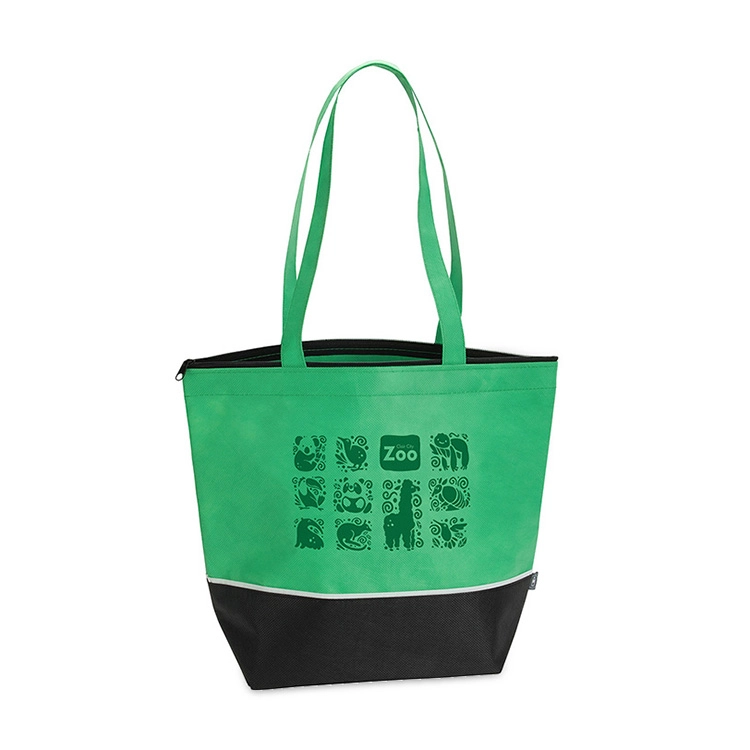 The rPET Foam Insulated Cooler Tote - 15 3/8" x 12 1/2" is made with eco-friendly 80 GSM recycled PET non-woven from 100% post-consumer water bottles. It comes with a large volume interior compartment with zippered closure and a 6" gusset. The interior is constructed of PE foam and aluminum foil insulation making this the perfect bag for lunch, picnics and groceries. It features 24" non-woven carry handles that matches the color of the bag. It features a gray woven trim that separates the black bottom from the colored top.