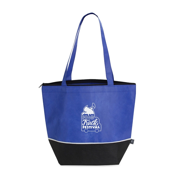 The rPET Foam Insulated Cooler Tote - 15 3/8" x 12 1/2" is made with eco-friendly 80 GSM recycled PET non-woven from 100% post-consumer water bottles. It comes with a large volume interior compartment with zippered closure and a 6" gusset. The interior is constructed of PE foam and aluminum foil insulation making this the perfect bag for lunch, picnics and groceries. It features 24" non-woven carry handles that matches the color of the bag. It features a gray woven trim that separates the black bottom from the colored top.