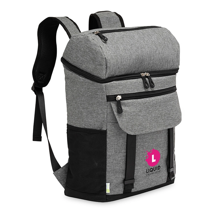 The rPET Heathered Gray Cooler Backpack - 18 Can has an 18-can capacity zippered main compartment with extra thick heat sealed PEVA lining and insulation foam. The main fabric is made from recycled water bottles. It also features two side mesh pockets, a bottle opener, one large zippered pocket and one open pocket with flap cover on the front to carry utensils or dry goods. The front side buckle straps can hold your beach mat or picnic blanket and the top zippered insulated compartment can hold your easy access snacks. Carry it using the padded adjustable backpack straps or the top carry handle. The bag combines a stylish design with useful functionality making it the perfect companion for day trips, picnics, work or travel.