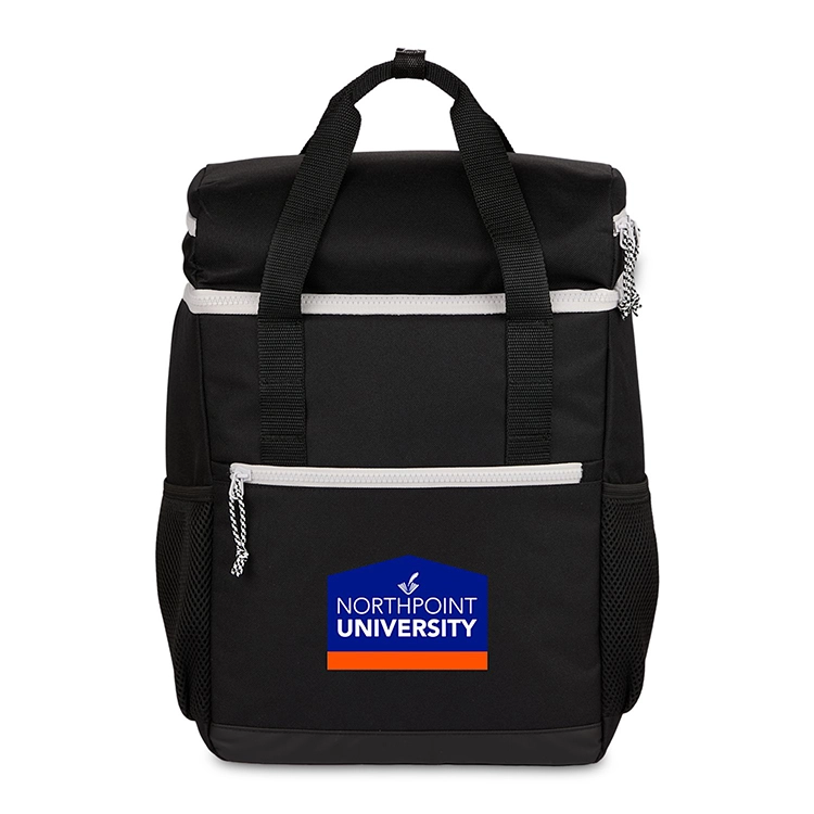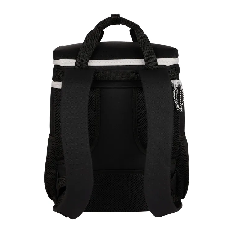 This backpack cooler combines recycled materials with practical cold storage for outdoor events and team activities. The 15L interior holds up to 16 cans and features a PEVA lining that helps maintain temperature and allows quick wipe-down cleaning. Exterior pockets keep smaller items and water bottles accessible, while padded shoulder straps support comfortable carrying throughout the day. Through the 1% For The Planet partnership, a portion of sales supports environmental nonprofits.