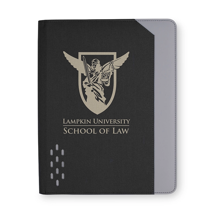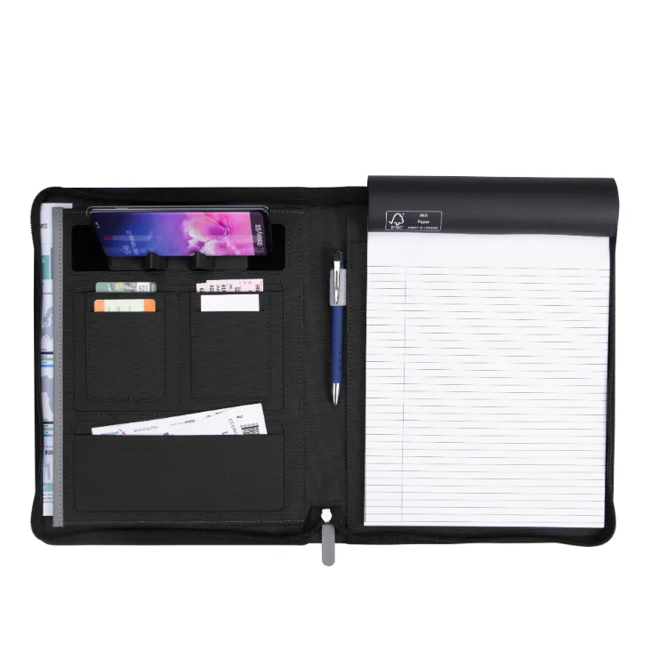 Designed for efficient organization, this eco-conscious padfolio features a zippered closure, built-in device stand, and a writing pad with FSC-certified paper. The interior includes slots for documents, cards, and a pen loop with a Souvenir Armor Pen already inserted. Its recycled PET cover aligns with sustainability goals while supporting everyday productivity.
