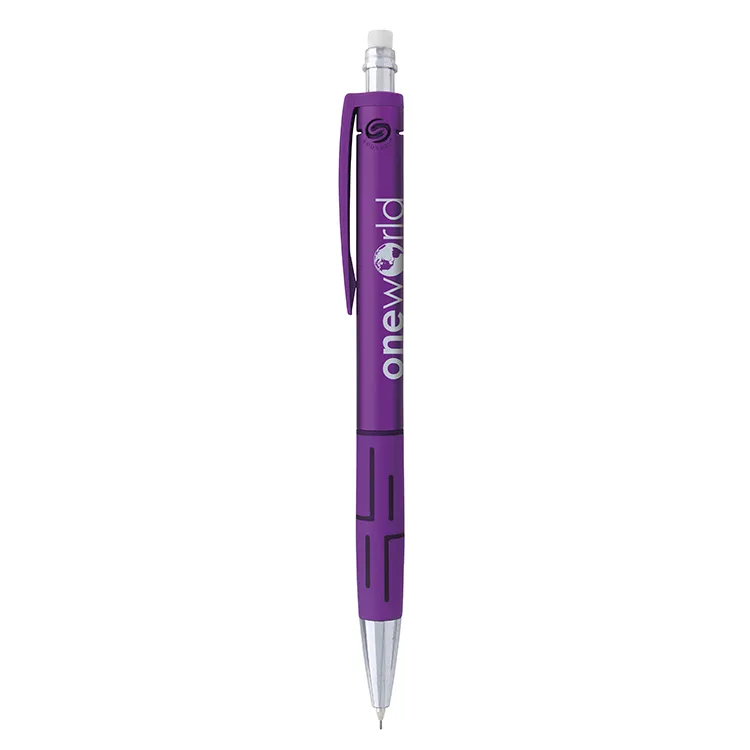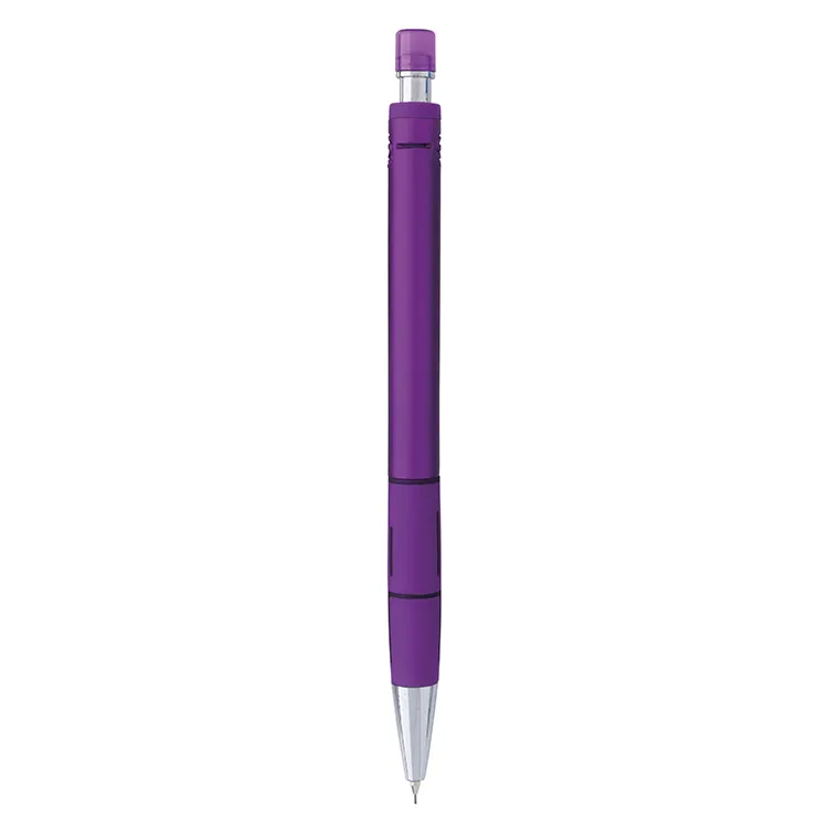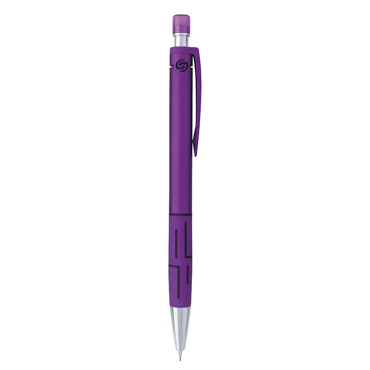 The metallic barrel of this mechanical pencil is perfectly complemented by a tone-on-tone rubberized grip with graphic design and coordinating translucent cap to protect the eraser. Comes with a graphite 0.5mm #2 lead. It workds with plunger-action mechanism and comes with a built-in eraser under the cap.
