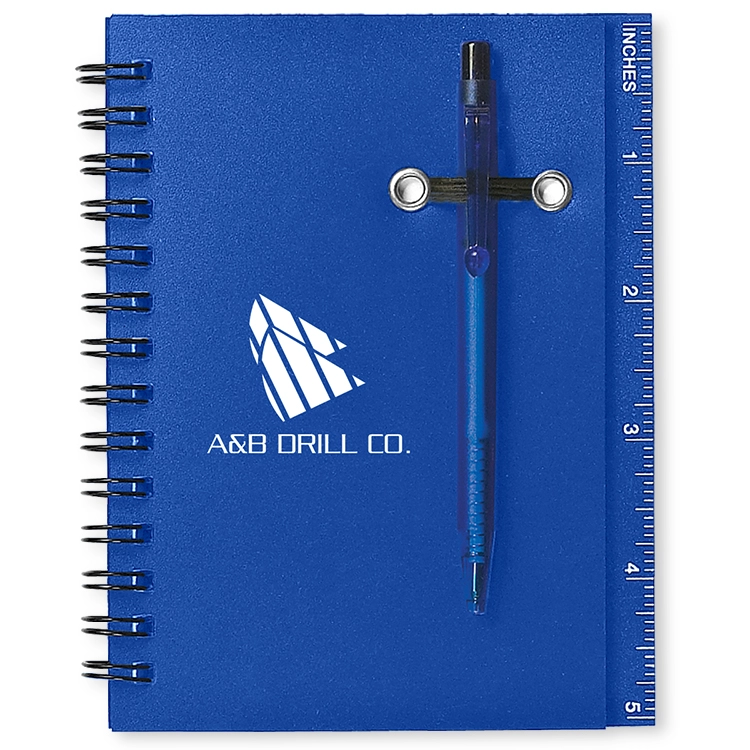 This compact notebook offers 50 lined pages and an integrated 5" ruler on the back cover for added functionality. A polypropylene cover enhances durability, while the elastic loop holds a matching retractable pen for easy access. Made with FSC® certified materials, it’s a practical and responsible choice for everyday use.