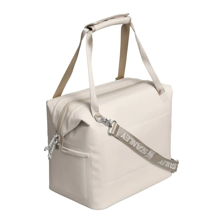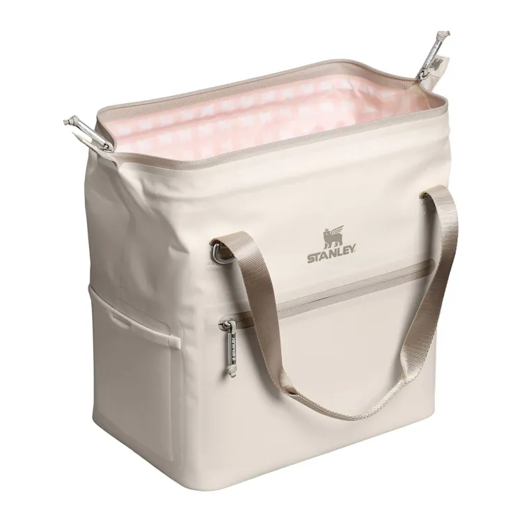 Designed for organized outdoor food and beverage storage, this cooler uses 100% recycled polyester and a structured hinge-top opening that allows the main compartment to open wide for easy packing. The 12-quart interior holds up to 20 cans, while a front zip pocket secures smaller essentials. Carry handles with a snap closure and an adjustable shoulder strap provide flexible transport options for events, picnics, or group outings.
