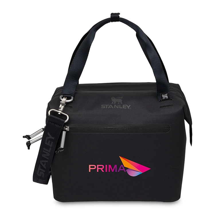 Built for outdoor meals and sustainable living, this mini cooler holds up to 10 cans and features a structured hinge-top design for quick, wide access. Made from 100% recycled polyester, it includes both snap-lock handles and a detachable shoulder strap. The winged bear liner and zip pocket add style and function for easy outings.