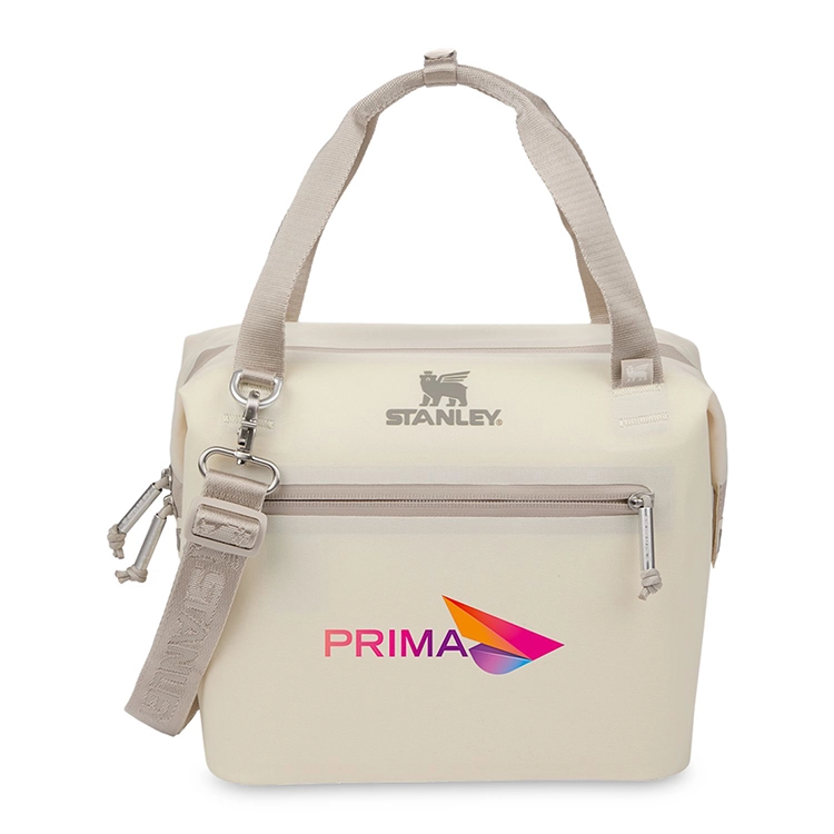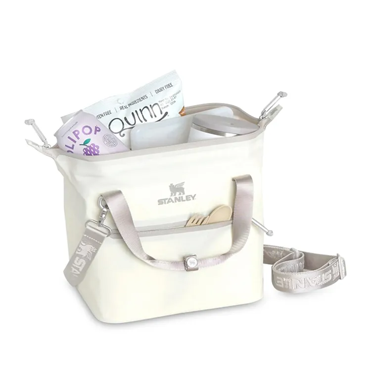 Built for outdoor meals and sustainable living, this mini cooler holds up to 10 cans and features a structured hinge-top design for quick, wide access. Made from 100% recycled polyester, it includes both snap-lock handles and a detachable shoulder strap. The winged bear liner and zip pocket add style and function for easy outings.