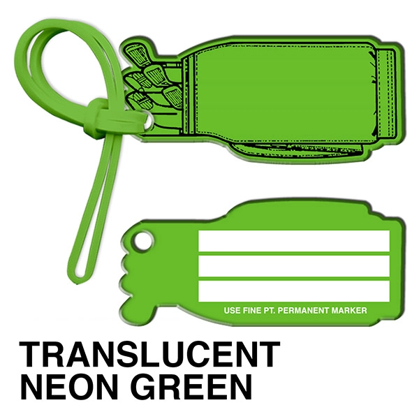 This Translucent Neon Golf Bag Shape ID Tag is made of durable, soft and flexible Sof-Touch® original vinyl. Compliant with federal product safety regulations. Features a strap to easily attach to your luggage. Easily notice your bags whether your in the airport, on the golf range, or at the tennis courts. Perfect giveaway for trade shows or corporate travel events.