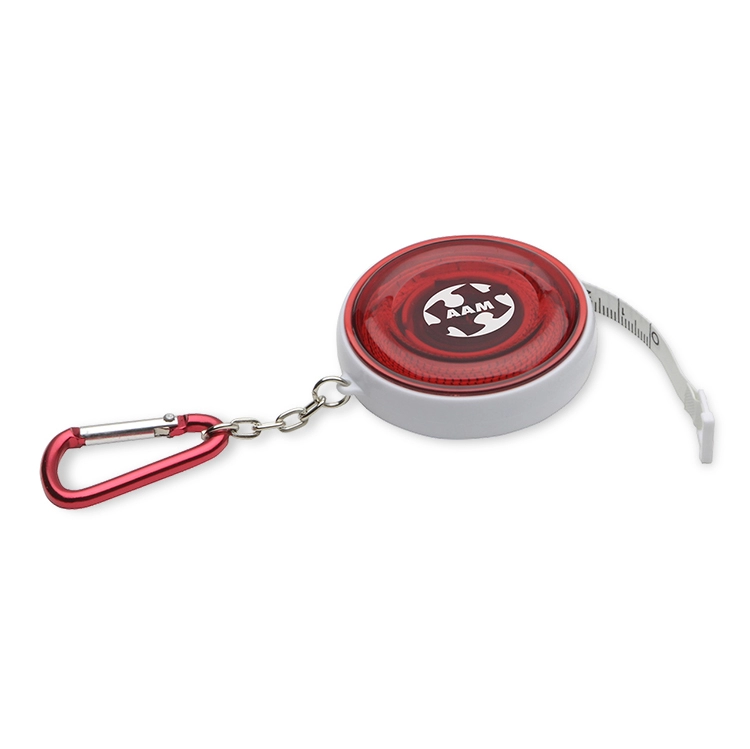 The Travel 5' Auto-Lock Tape Measure Carabiner Keychain is a compact and versatile tool for quick measurements on the go. With its 5 ft. measuring length, this white tape measure is made from flexible polyester tape and adorned with black metric markings for easy reading. The easy pull auto-lock tape feature makes it effortless to secure the tape in place. When you're done, simply retract it with a push of a button. The carabiner-style keychain allows for easy attachment to key fobs or zippers, ensuring it's always within reach. Whether it's a builder tradeshow or a costume convention, this tape measure keychain makes a fun and practical giveaway.