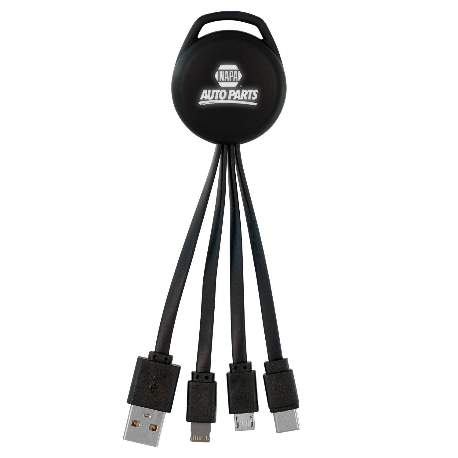 This Trio 3-in-1 Noodle Cable - Logo Lights Up features an Apple® 8-pin devices compatibility, micro USB and Type C USB. Light turns on to illuminate your logo. Can charge multiple devices at once which makes it easy to charge any device when needed. Perfect for home and office or travel.