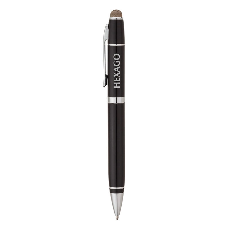 Twist-action ballpoint pen features aluminum construction chrome accents twist tip and pocket clip. It also has a durable conductive fiber capacitive stylus tip that works with touch screen devices.