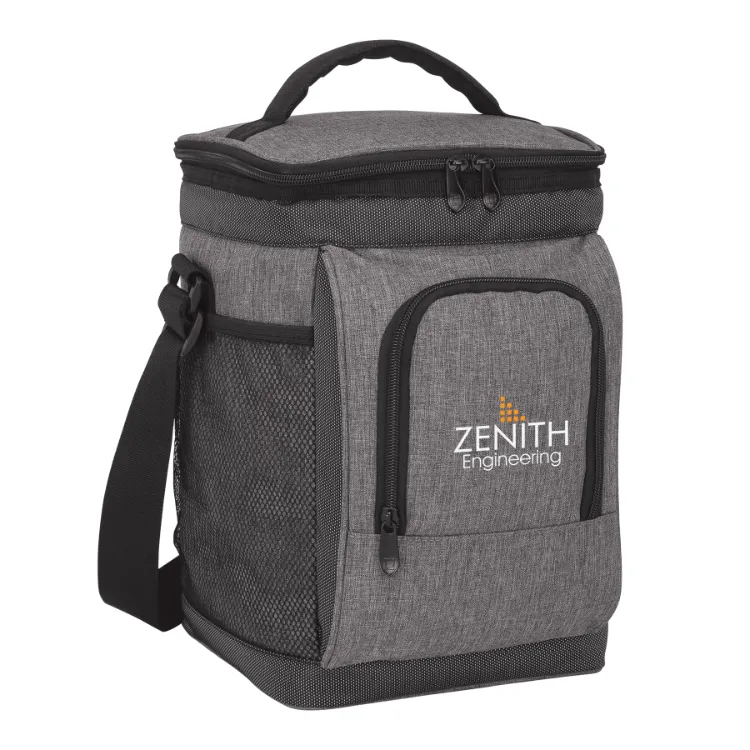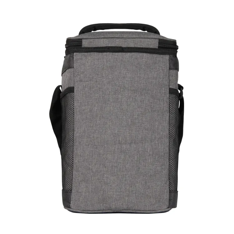 The Two-Tone PEVA Lined Cooler - 18 Can is made of gray two-tone 300D with extra-durable two-tone 1680D polyester trims. The zippered main compartment has a heat-sealed PEVA lining and will hold up to 18 cans. It features an easy-access front zippered compartment and two side mesh pockets provide extra outside storage. Carry it with the top padded handle or the 1 1/2 x 48” adjustable shoulder strap.