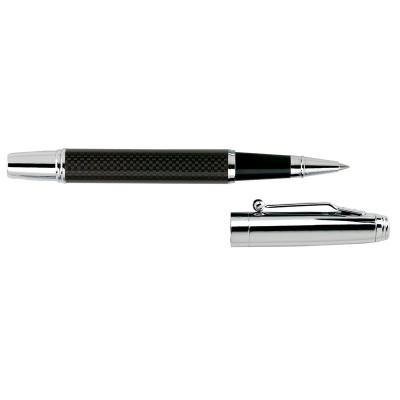 Euro-style cap-off rollerball with brass cap a high-gloss carbon fiber barrel and chrome pocket clip and trim.